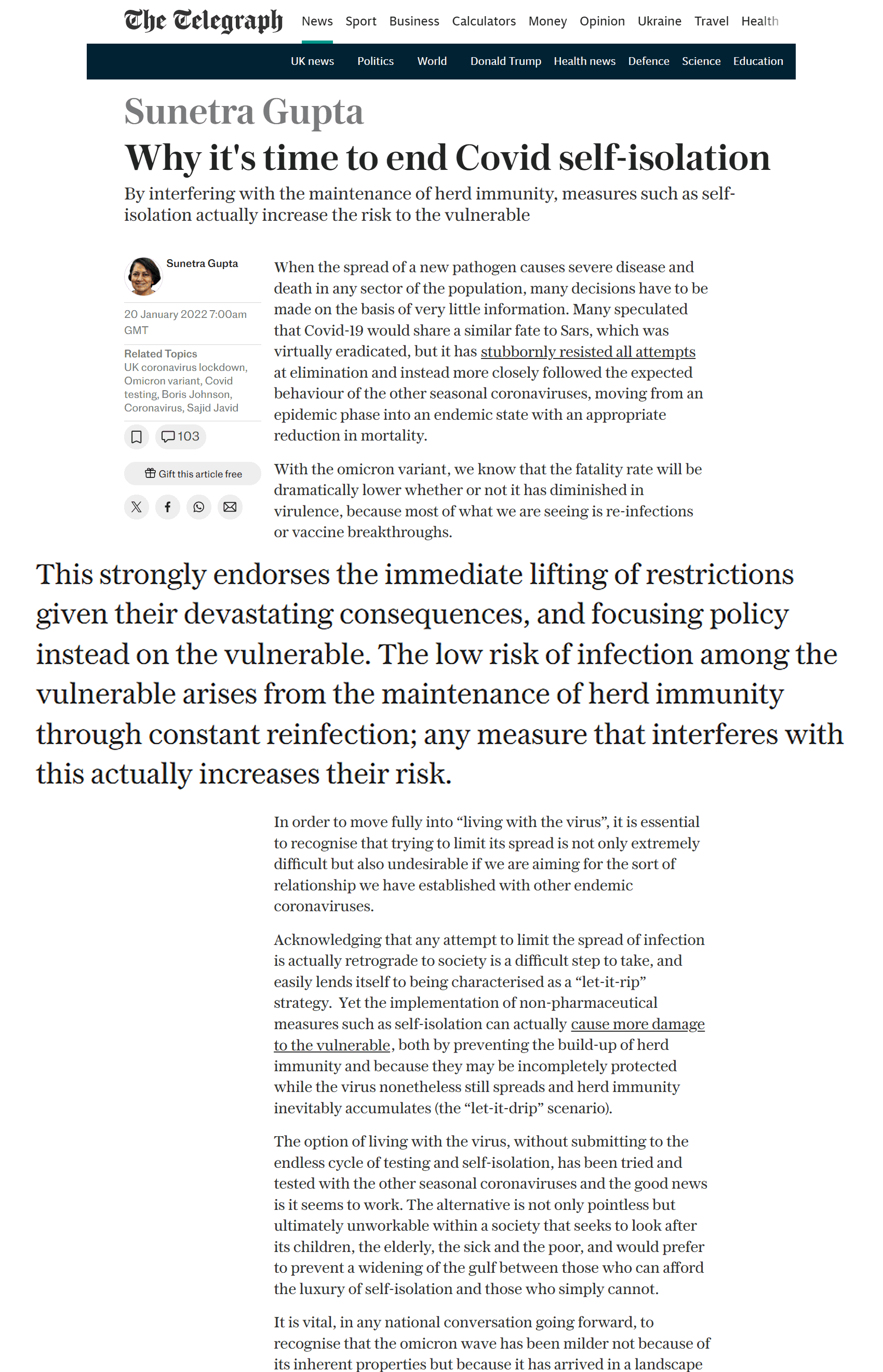 Sunetra Gupta (20 Jan 2022): ‘Why it’s time to end Covid isolation’.