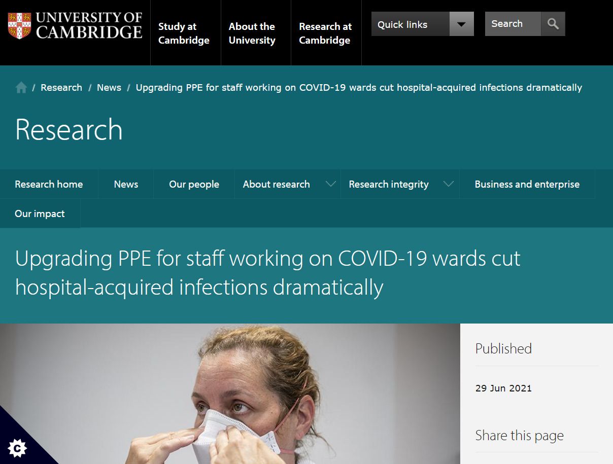 📖 (29 Jun 2021 ~ University of Cambridge / Cambridge University Hospitals (CUH) NHS Foundation Trust) Upgrading PPE for staff working on COVID-19 wards cut hospital-acquired infections dramatically ➤